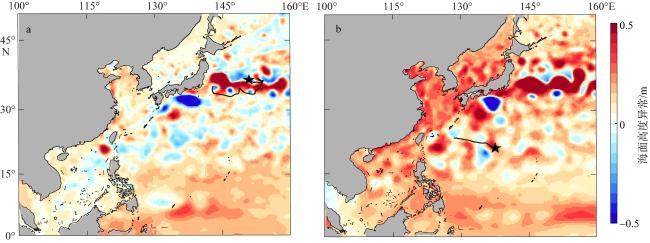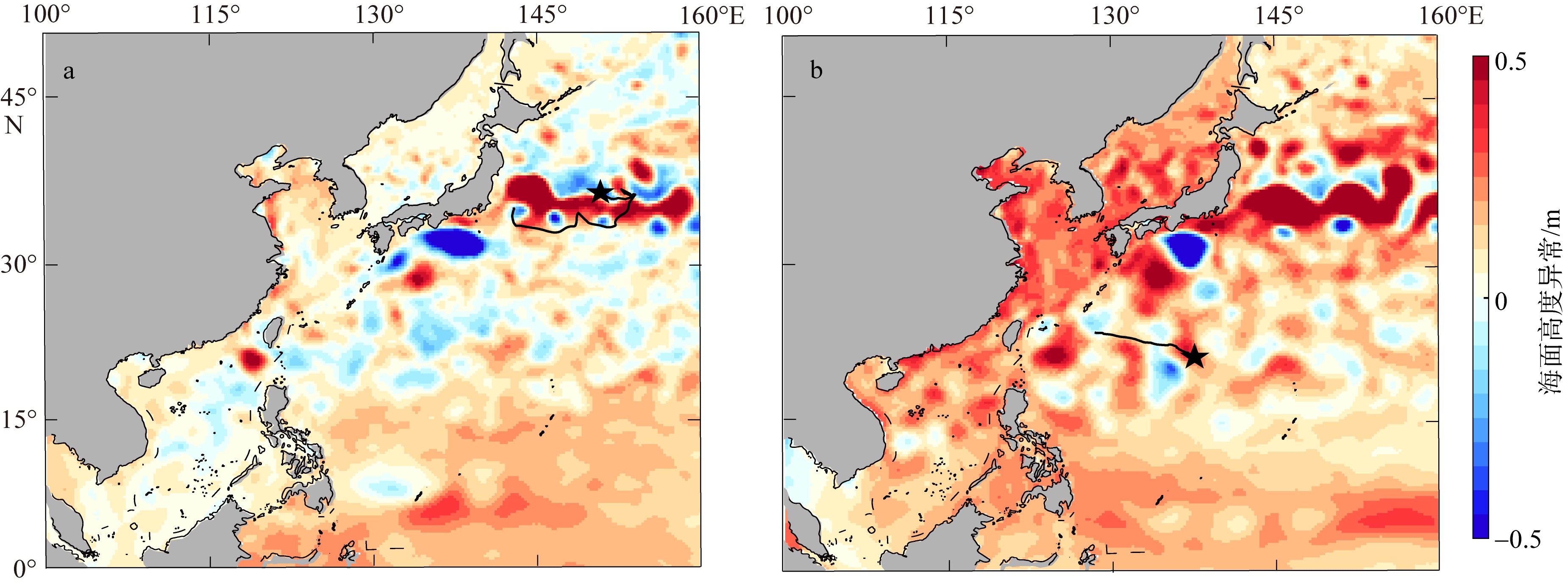 图5 编号827620中尺度涡旋(a)和编号796972中尺度涡旋(b)的轨迹图黑色星形表示涡旋生成位置, 黑色曲线表示涡旋轨迹, 填色表示涡旋生成初期卫星观测海面高度异常。该图基于自然资源部标准地图服务网站下载的审图号为GS(2016)1664号的标准地图制作, 底图无修改 Fig. 5 Trajectories of mesoscale eddies 827620 (a) and 796972 (b). Black stars indicate the eddy generation location, and shading represents initial sea level anomaly during eddy formation |