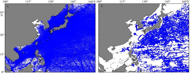 图1 研究海域建立模型所用历史温盐剖面资料分布图(a)和2021—2022年用于结果检验的温剖面分布图(b)该图基于自然资源部标准地图服务网站下载的审图号为GS(2016)1664号的标准地图制作, 底图无修改 Fig. 1 Distribution of historical temperature and salinity profiles used for model construction in the study area (a) and temperature profiles used for result validation in 2021-2022 (b) |