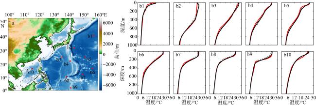 图3 Argo数据空间分布(a)和Argo观测、重构场、WOA18月均气候态单点温度垂向廓线图(b1—b10)图a基于自然资源部标准地图服务网站下载的审图号为GS(2016)1664号的标准地图制作, 底图无修改, 红色星号表示Argo的空间点位b1—b10。图b中红色实线表示Argo观测数据, 黑色实线表示重构场数据, 黑色虚线表示WOA18月均气候态数据 Fig. 3 Spatial distribution of Argo data (a) and vertical temperature profiles of Argo observations, reconstructed field, and WOA18 monthly climatology for individual locations (b1—b10). (a) Shading represents sea surface height with red stars indicating Argo spatial locations; (b1—b10) Red solid lines: Argo observations; black solid lines: reconstructed field; black dashed lines: WOA18 monthly climatology |