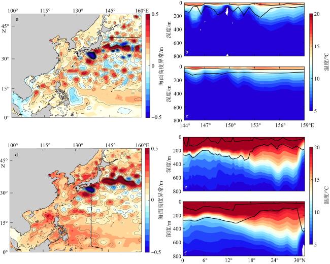 图4 实测数据轨迹(a、d)及重构场与实测数据温度断面图(b、c、e、f)a. 2019年6月17日—6月29日实测数据在西北太平洋中的轨迹(黑色曲线)及实测数据期间卫星观测的平均海面高度异常(填色); d. 2022年8月7日—10月10日实测数据在西北太平洋中的轨迹(黑色曲线)及实测数据期间卫星观测的平均海表面高度异常(填色), 该图基于自然资源部标准地图服务网站下载的审图号为GS(2016)1664号的标准地图制作, 底图无修改。b, e. 实测数据温度剖面; c, f. 重构数据温度剖面。剖面图中黑色折线表示温跃层上下边界 Fig. 4 Observed data trajectories (a, d) and cross-sections of the reconstructed field versus observed temperature (b, c, e, f). (a) Trajectory of observed data in the Northwest Pacific from June 17 to 29, 2019 (black curve) and the mean sea surface height anomaly (SSHA) from satellite observations during the observation period (color shading); (d) trajectory of observed data in the Northwest Pacific from August 7 to October 10, 2022 (black curve) and the mean SSHA from satellite observations during the observation period (color shading); (b, e) observed temperature profiles; (c, f) reconstructed temperature profiles. In the cross-section plots, the black polylines represent the upper and lower boundaries of the thermocline |