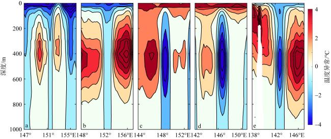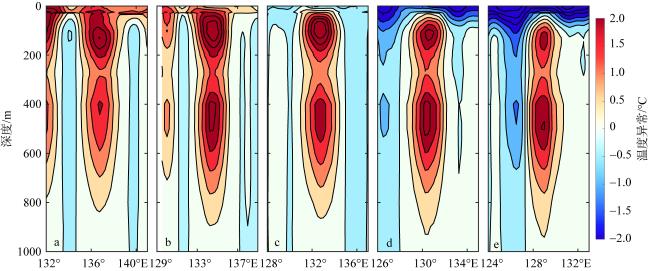 图6 827620中尺度涡旋不同阶段的重构场过涡心的温度异常纬向断面图a. 2021年3月1日; b. 2021年5月10日; c. 2021年8月8日; d. 2021年9月27日; e. 2021年12月6日。图中黑线为温度异常等值线 Fig. 6 Zonal sections of temperature anomalies across eddy 827620 center at different development stages of the reconstructed field (a-e). Shading represents anomaly intensity (red: positive/warm; blue: negative/cold). Black contours represent temperature anomaly isotherms |