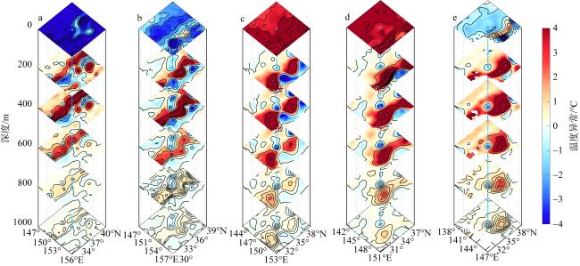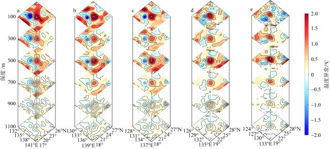 图8 827620中尺度涡旋不同阶段的重构场温度异常三维结构图a. 2021年3月1日; b. 2021年5月10日; c. 2021年8月8日; d. 2021年9月27日; e. 2021年12月6日。图中黑线为温度异常等值线 Fig. 8 Three-dimensional structures of temperature anomalies for eddy 827620 at different stages of the reconstructed field (a-e). Visualization convention follows Fig. 6 |