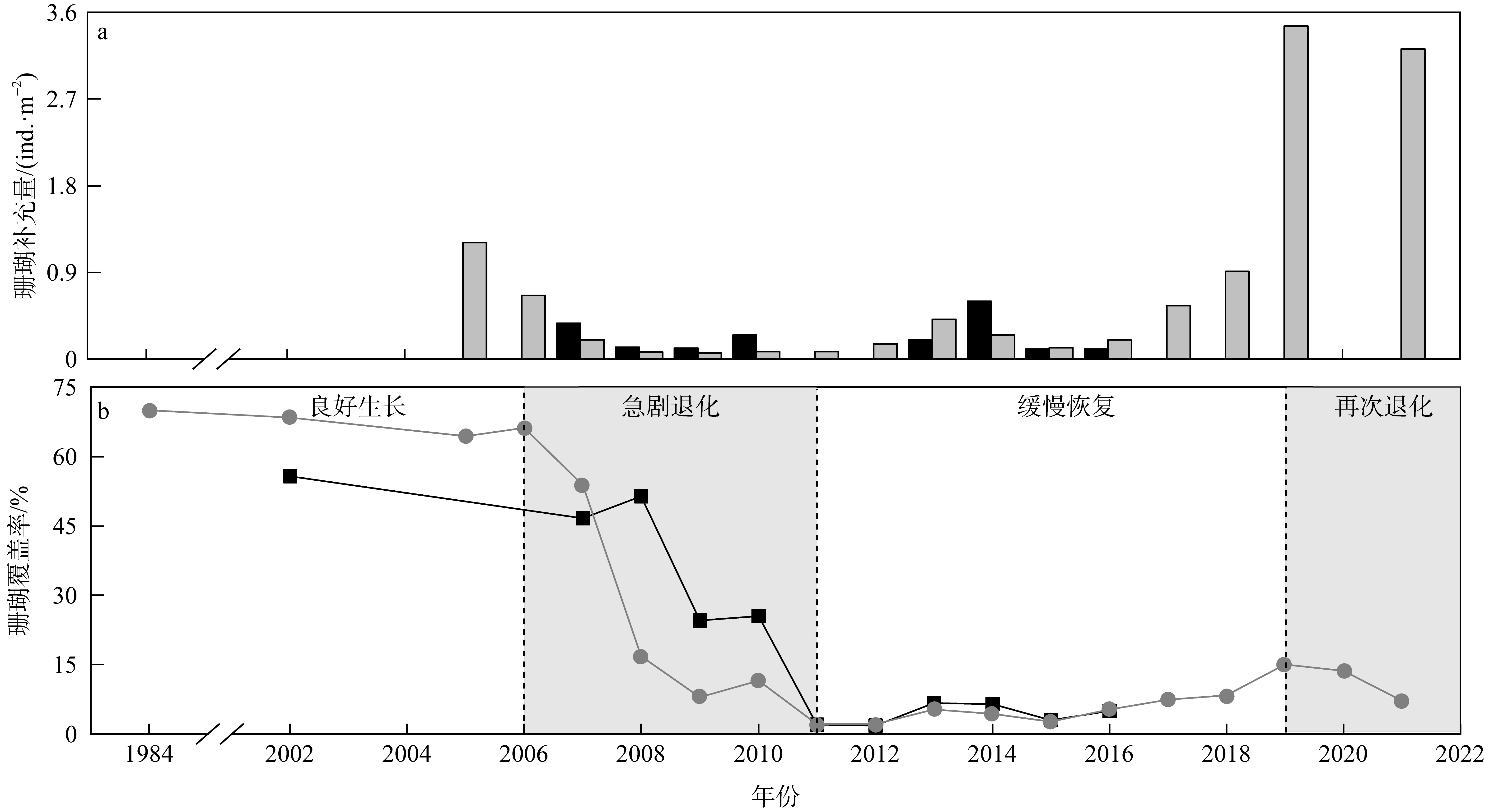 图2 1984—2021年永兴岛及东南侧造礁石珊瑚覆盖率和补充量年际变化a. 永兴岛及东南侧造礁石珊瑚补充量年变化; b. 永兴岛及东南侧造礁石珊瑚覆盖率年变化 Fig. 2 Interannual variations in scleractinian coral coverage and recruitment at Yongxing Island and its southeastern side from 1984 to 2021. (a) Annual variations in scleractinian coral recruitment; (b) annual variations in scleractinian coral coverage |