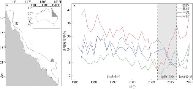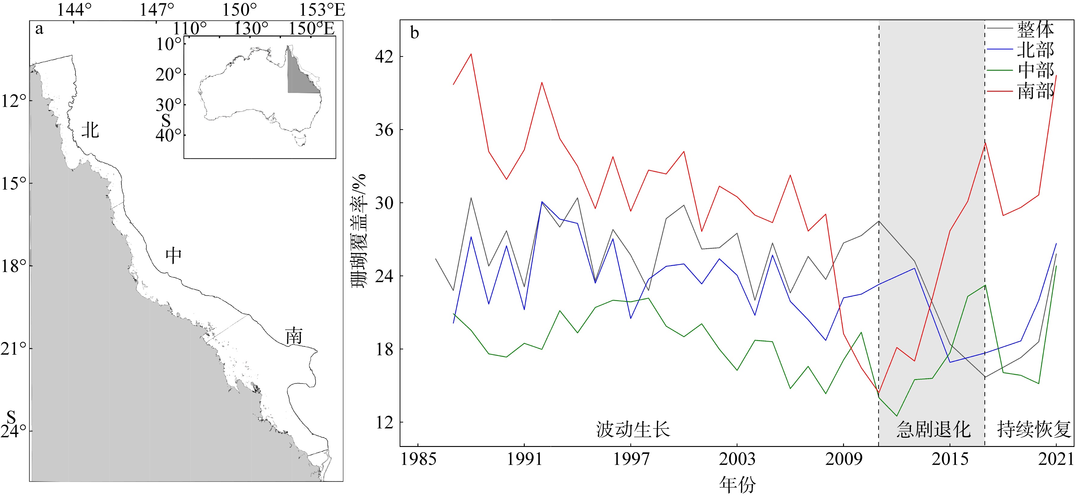 图3 1986—2021年澳大利亚大堡礁珊瑚覆盖率年际变化a. 澳大利亚大堡礁的研究区示意图; b. 澳大利亚大堡礁整体及北、中、南部珊瑚覆盖率变化 Fig. 3 Interannual variations in coral coverage at Australia’s Great Barrier Reef from 1986 to 2021. (a) Schematic map of the study area; (b) variations in coral coverage for the entire reef and its northern, central and southern sections |