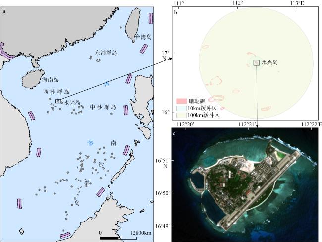 图1 永兴岛区域示意图a. 永兴岛的位置示意图; b. 永兴岛的10km和100km缓冲区范围图; c. 永兴岛的区域示意图。a基于2018年自然资源部标准地图服务网站下载的审图号为GS(2022)4318 号的标准地图制作, 底图无修改; b、c基于联合国环境规划署世界保护监测中心(UNEP-WCMC)全球珊瑚礁数据库(Version 4.1, 2021)和2024年哨兵2号(Sentinel-2)影像制作 Fig. 1 Schematic diagram of Yongxing Island in the South China Sea. (a) Location map of Yongxing Island; (b) 10 km and 100 km buffer zones of Yongxing Island; (c) regional diagram of Yongxing Island |