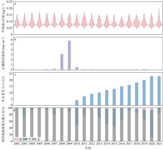 图4 2002—2021年永兴岛各退化控制因素指标年际变化a. 永兴岛叶绿素a含量; b. 长棘海星密度; c. 年末常住人口数; d. 海洋热浪级别天数占比 Fig. 4 Interannual variations in degradation control factors at Yongxing Island from 2002 to 2021. (a) Chlorophyll-a concentration; (b) density of crown-of-thorns starfish; (c) year-end resident population; (d) percentage of days with marine heatwave levels |