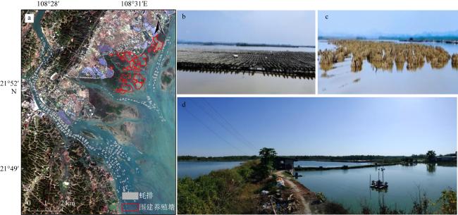 图7 研究区内人类活动情况a. 茅岭江河口蚝排与养殖塘分布(基于2023年1月20日的Sentinel-2A影像); b. 茅岭江河口蚝排; c. 茅岭江河口蚝柱; d. 围建养殖塘 Fig. 7 Human activities in the study area. (a) Distribution of oyster rafts and aquaculture ponds in the Maolingjiang Estuary; (b) oyster rafts in the Maolingjiang Estuary; (c) oyster culture poles in the Maolingjiang Estuary; (d) constructed aquaculture ponds |