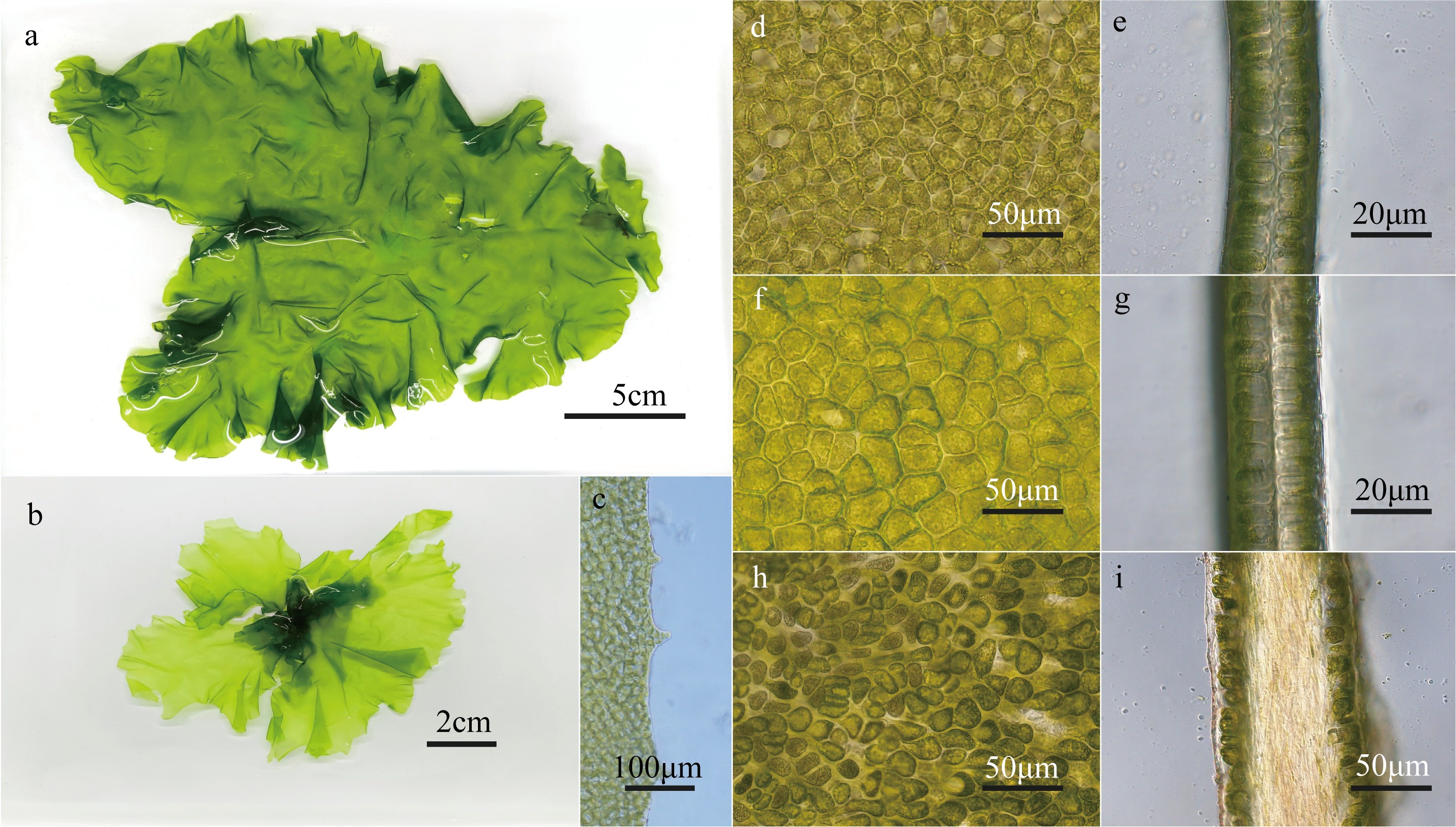 图2 大野石莼的形态学a. 湛江个体; b. 防城港个体; c. 藻体边缘具齿状结构; d. 藻体上部表面观; e. 藻体上部切面观; f. 藻体中部表面观; g. 藻体中部切面观; h. 藻体基部表面观; i. 藻体基部切面观 Fig. 2 Morphology of Ulva ohnoi. (a) Specimen from Zhanjiang; (b) specimen from Fangchenggang; (c) dentate structures at the thallus margin; (d) surface view of upper thallus; (e) cross-section view of upper thallus; (f) surface view of middle thallus; (g) cross-section view of middle thallus; (h) surface view of basal thallus; (i) cross-section view of basal thallus |