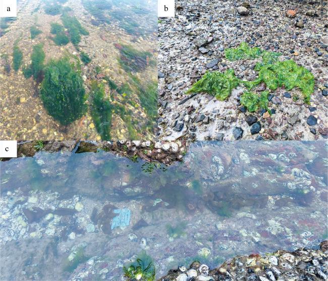 图1 大野石莼栖息地环境a. 湛江特呈岛, 固着于石块或贝壳上的大野石莼; b. 湛江特呈岛, 被冲至岸边的漂浮个体; c. 防城港怪石滩, 生长在潮汐池中的个体 Fig. 1 Ulva ohnoi habitat environment. (a) U. ohnoi attached to rocks or shells at Techeng Island, Zhanjiang, Guangdong; (b) floating individuals of U. ohnoi washed ashore on Techeng Island, Zhanjiang, Guangdong; (c) U. ohnoi specimens growing in a tidal pool at Guaishi Beach, Fangchenggang, Guangxi |