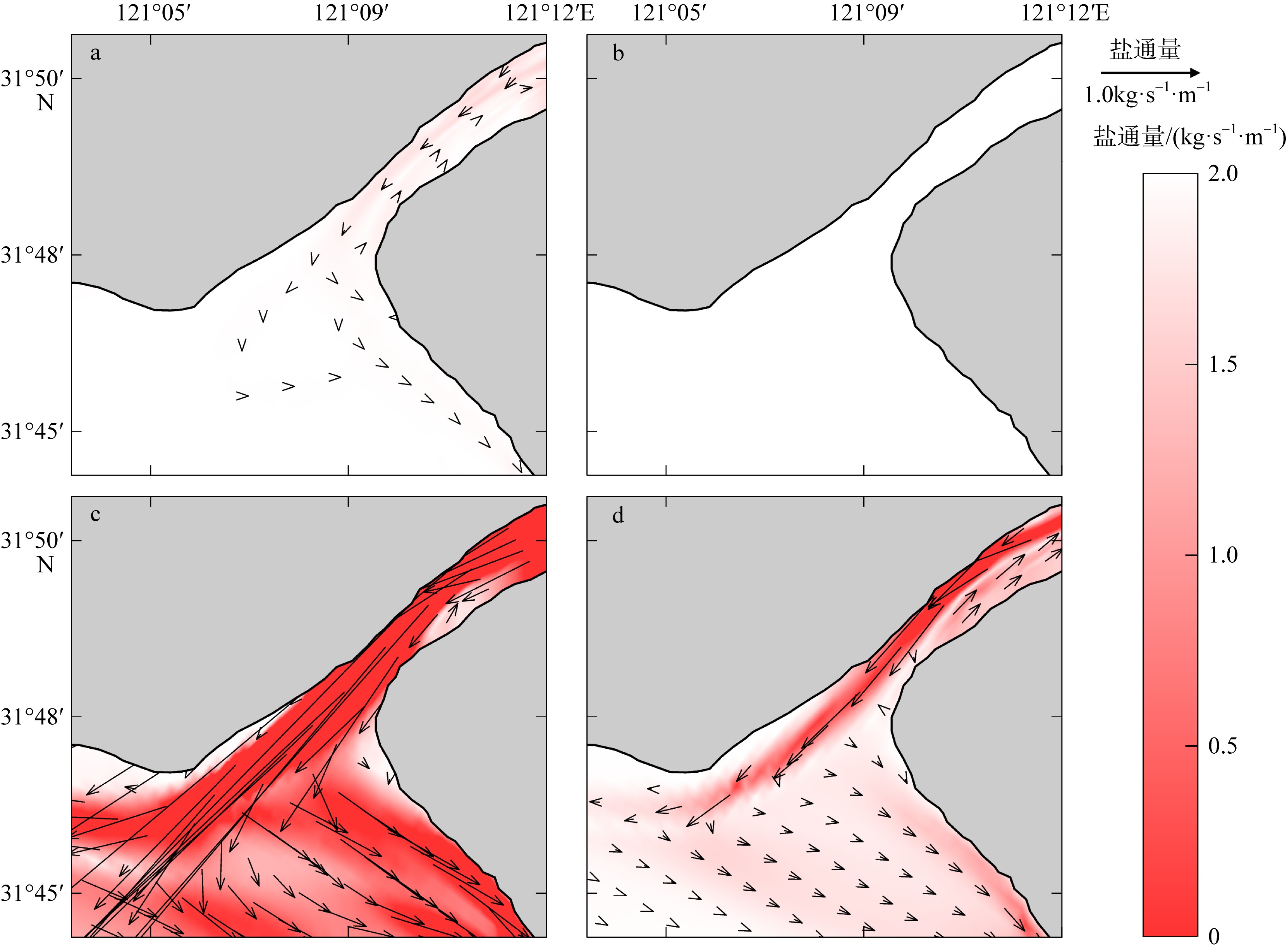 图11 2021年(a、b)和2007年(c、d) 2月大潮期间(a、c)和小潮期间(b、d)北支上端区域单宽盐通量平面分布该图基于自然资源部标准地图服务网站下载的审图号为GS(2019)3266号的标准地图制作, 底图无修改 Fig. 11 Planar distribution of net unit-width salt flux in the upper region of the North Branch during spring tide (a, c) and neap tide (b, d) in February of 2021 (a, b) and 2007 (c, d) |