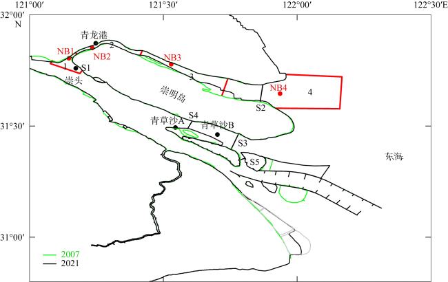 图2 长江口2007年和2021年岸线该图基于自然资源部标准地图服务网站下载的审图号为GS(2019)3266号的标准地图制作, 底图无修改。图中黑点为青龙港、崇头、青草沙A、青草沙B测站; 红点为北支模式输出点NB1、NB2、NB3、NB4; 红线将北支划分为区域1、区域2、区域3和区域4; S1、S2为北支上段、下段横断面; S3、S4为北港中段、上段横断面; S5为横沙小港横断面 Fig. 2 Shorelines of the Changjiang Estuary in 2007 and 2021. The black dots in the figure represent the measuring stations; the red dots represent the model output points in the North Branch; the red lines divide the North Branch into four areas. S1 and S2 are the transects of the upper and lower reaches of the North Branch; S3 and S4 are the transects of the middle and upper reaches of the North Channel; S5 is the transect in the Hengsha Channel |