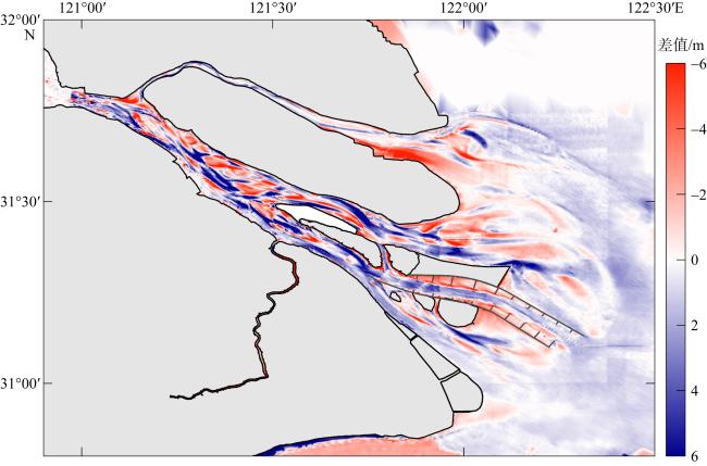 图3 2007年至2021年长江口水深变化该图基于自然资源部标准地图服务网站下载的审图号为GS(2019)3266号的标准地图制作, 底图无修改。红色表示淤积; 蓝色表示侵蚀 Fig. 3 Changes in the depth of the Changjiang Estuary from 2007 to 2021. Red indicates deposition; blue indicates erosion |