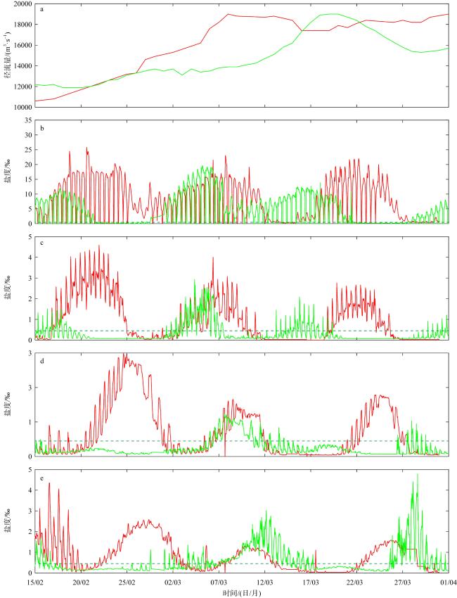 图4 2月15日—3月31日大通实测径流量(a)和青龙港(b)、崇头(c)、青草沙A (d)、青草沙B (e)测站表层盐度随时间变化曲线图中红线为2007年; 绿线为2025年。图中虚线表示盐度0.45‰, 为饮用水盐度标准 Fig. 4 Temporal variation in the measured river discharge at Datong Station (a), and surface salinity at measuring stations Qinglonggang (b), Chongtou (c), Qingcaosha A (d), and Qingcaosha B (e), from February 15 to March 31. The red line represents 2007, and the green line represents 2025 |