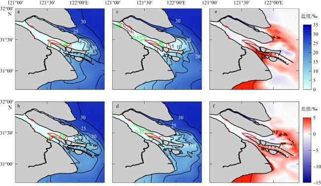 图6 2021年与2007年2月大潮和小潮期间的潮周期和垂向平均盐度分布以及2021年与2007年潮周期和垂向平均盐度差值分布a. 2021年2月大潮; b. 2021年2月小潮; c. 2007年2月大潮; d. 2007年2月小潮; e. 2021年与2007年2月大潮盐度差值; f. 2021年与2007年2月小潮盐度差值。该图基于自然资源部标准地图服务网站下载的审图号为GS(2019)3266号的标准地图制作, 底图无修改 Fig. 6 Distribution of tidal-period and vertically averaged salinity during spring tide (a, c, e) and neap tide (b, d, f) in February 2021 (a, b) and 2007 (c, d), as well as the distribution of differences in tidal-period and vertically averaged salinity between 2021 and 2007 (e, f) |