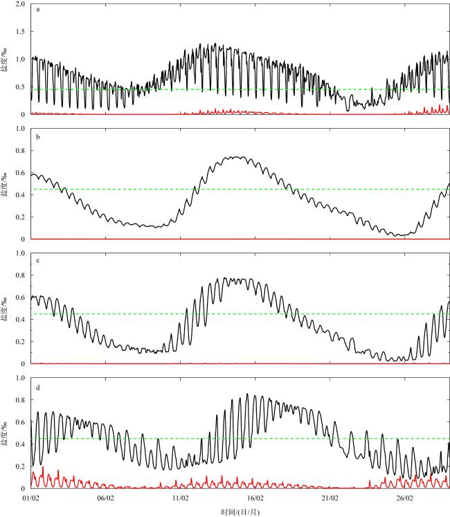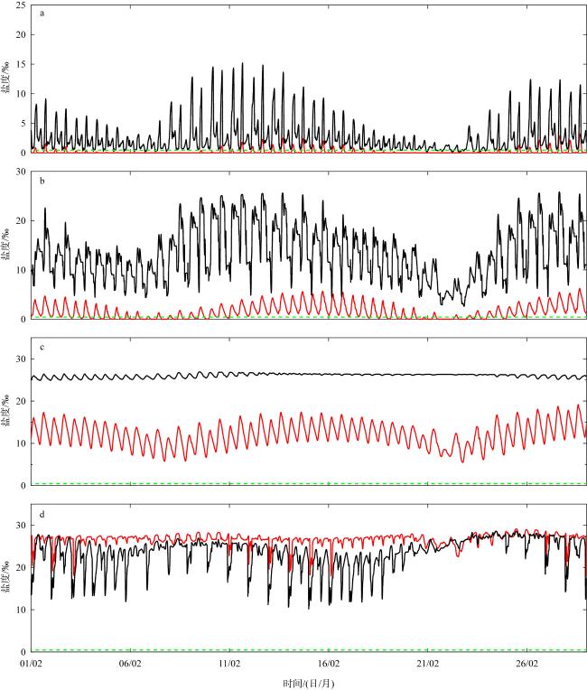 图7 NB1 (a)、NB2 (b)、NB3 (c)和NB4 (d)输出点表层盐度随时间变化图中红线为2021年; 黑线为2007年。绿色虚线表示盐度0.45‰ Fig. 7 Temporal variations of surface salinity at the output points of NB1 (a), NB2 (b), NB3 (c), and NB4 (d). The red line represents 2021; the black line represents 2007. The green dashed line indicates a salinity of 0.45‰ |