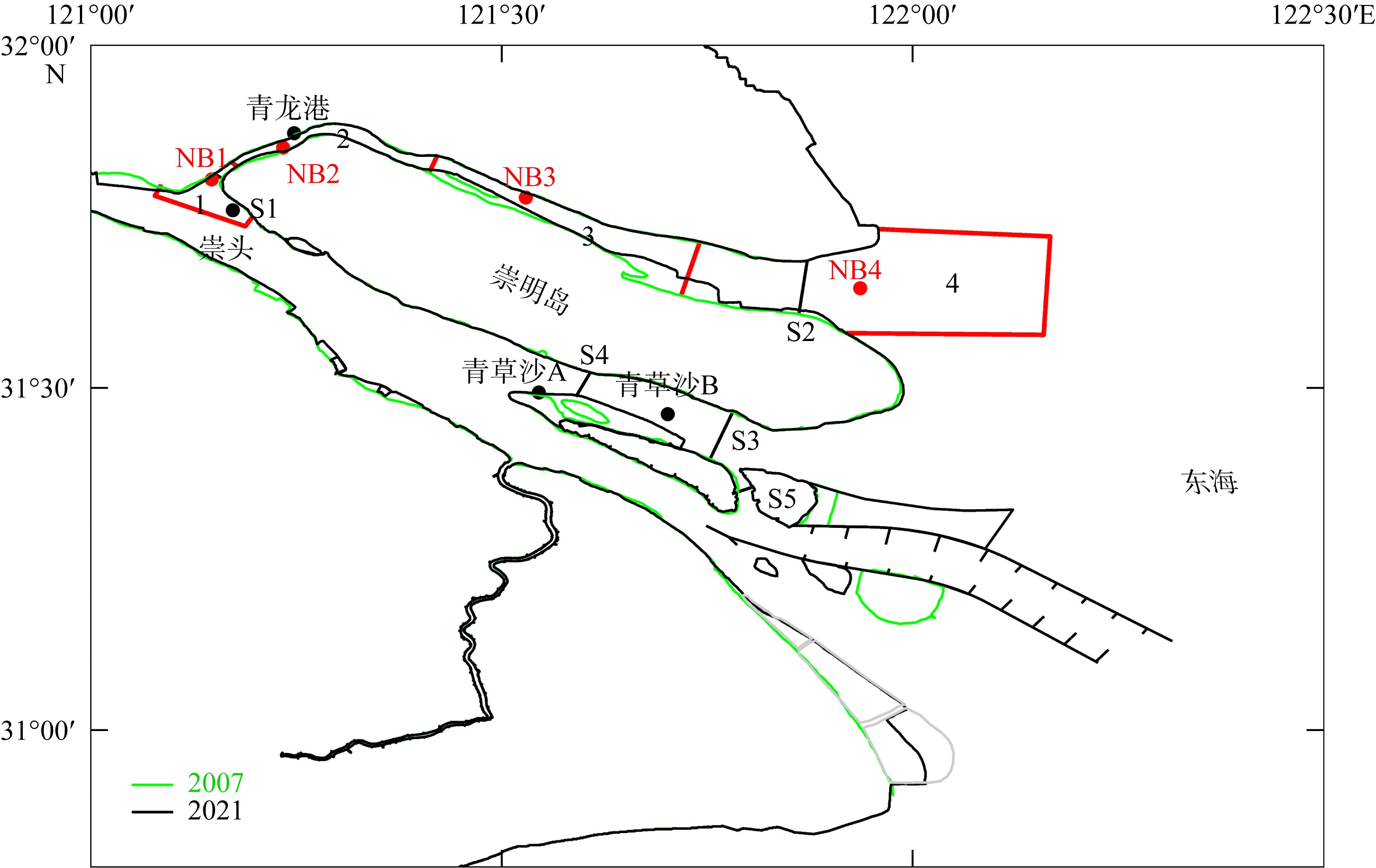 Shorelines of the Changjiang Estuary in 2007 and 2021. The black dots in the figure represent the measuring stations; the red dots represent the model output points in the North Branch; the red lines divide the North Branch into four areas. S1 and S2 are the transects of the upper and lower reaches of the North Branch; S3 and S4 are the transects of the middle and upper reaches of the North Channel; S5 is the transect in the Hengsha Channel"