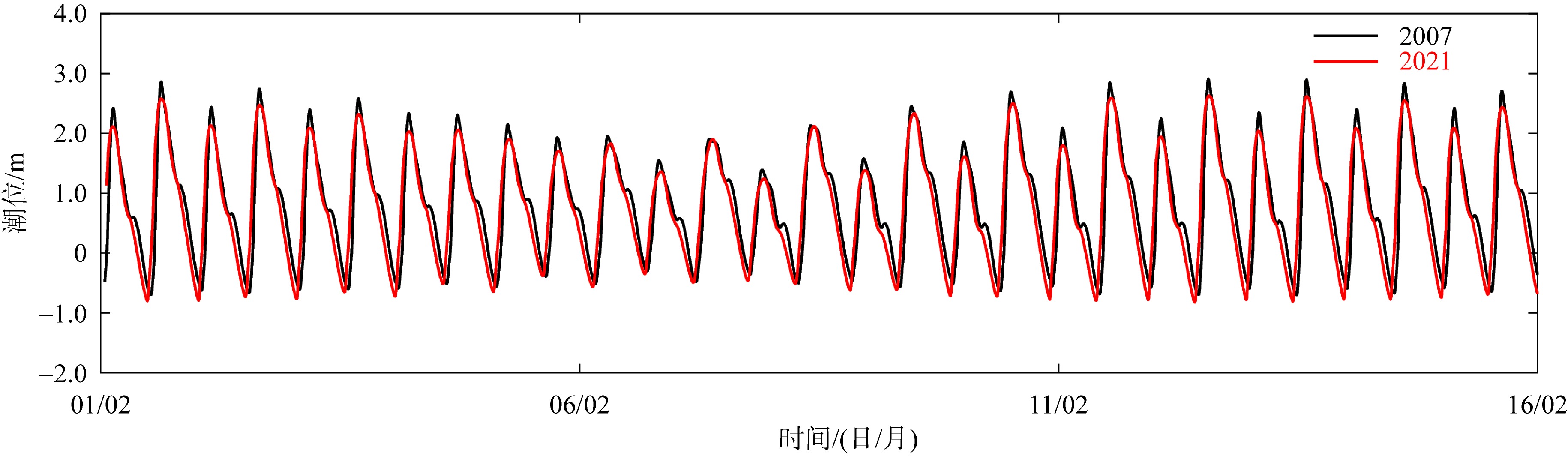 Tidal prism during spring tide, middle tide after spring tide, neap tide, middle tide after neap tide and the full tidal cycles across the transect S2 in the North Branch and transect S3 in the North Channel in February under the river regime conditions of 2007 and 2021 (unit: ×108m3)"