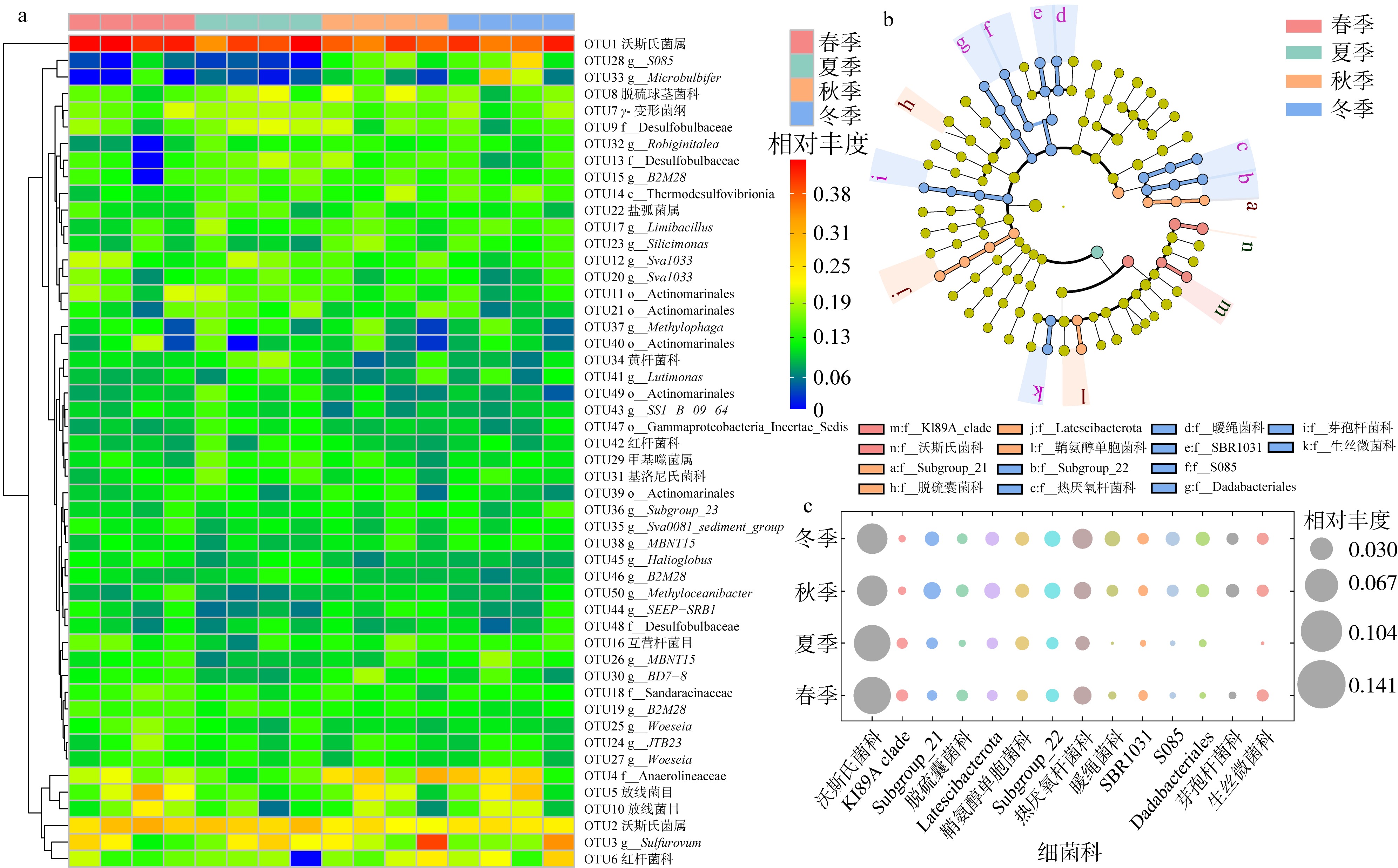 Heatmap showing the distribution of the top 50 OTUs in different seasonal samples (a), LEfSe analysis revealing the significant difference of bacterial families among different seasons (b), and bubble plot reflecting the relative abundance of bacteria families with significant differences (c)"