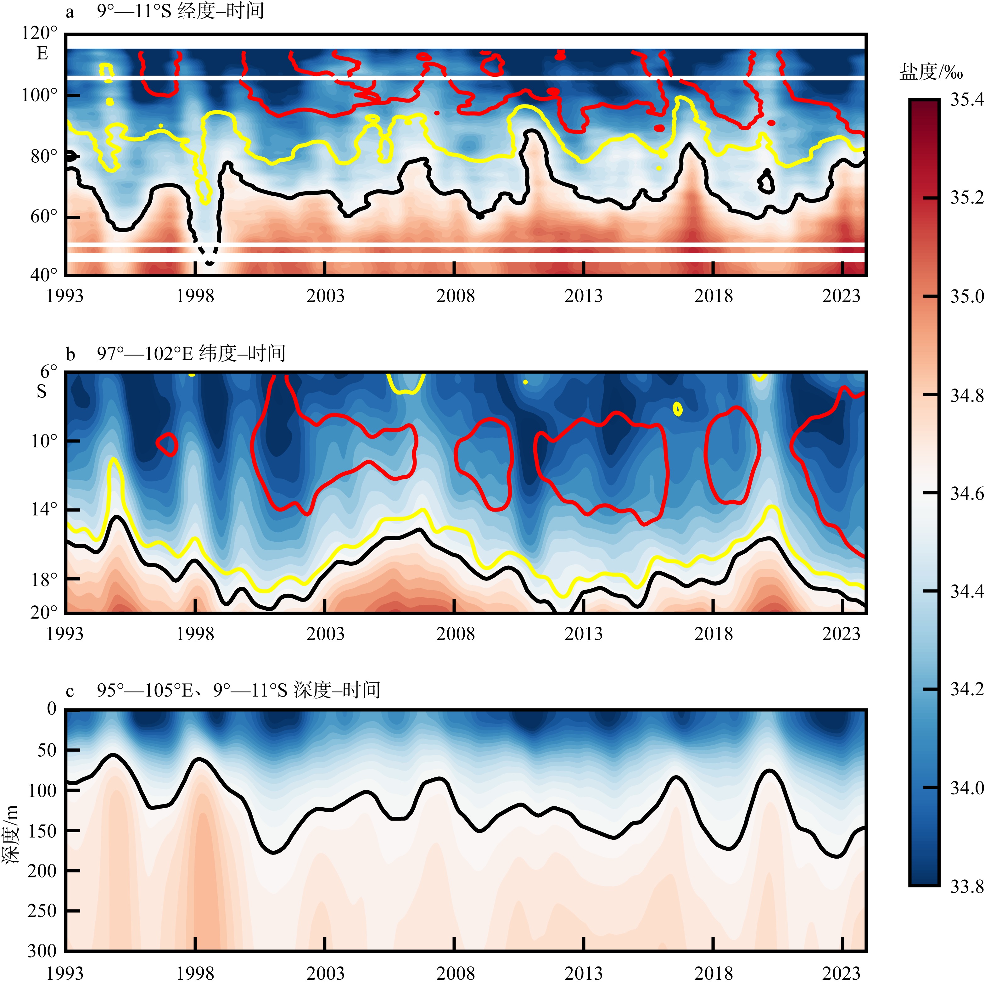 Interannual-decadal variations in the three-dimensional structure of the low-salinity tongue in the southeastern Indian Ocean. (a) Longitude-time Hovmöller diagram of sea surface salinity (shaded, units: ‰) averaged over 9° to 11°S, with the 34.6 ‰ isohaline at 0 m (black line), 50 m (yellow line), and 100 m (red line) after 13-month running mean; (b) similar to (a), but for the latitude-time Hovmöller diagram of salinity averaged over 97° to 102°E; (c) depth-time diagram of salinity (shaded, units: ‰) averaged within 95° to 105°E and 9° to 11°S, with the 34.6 ‰ isohaline at 0 m (black line) after a 13-month running mean"