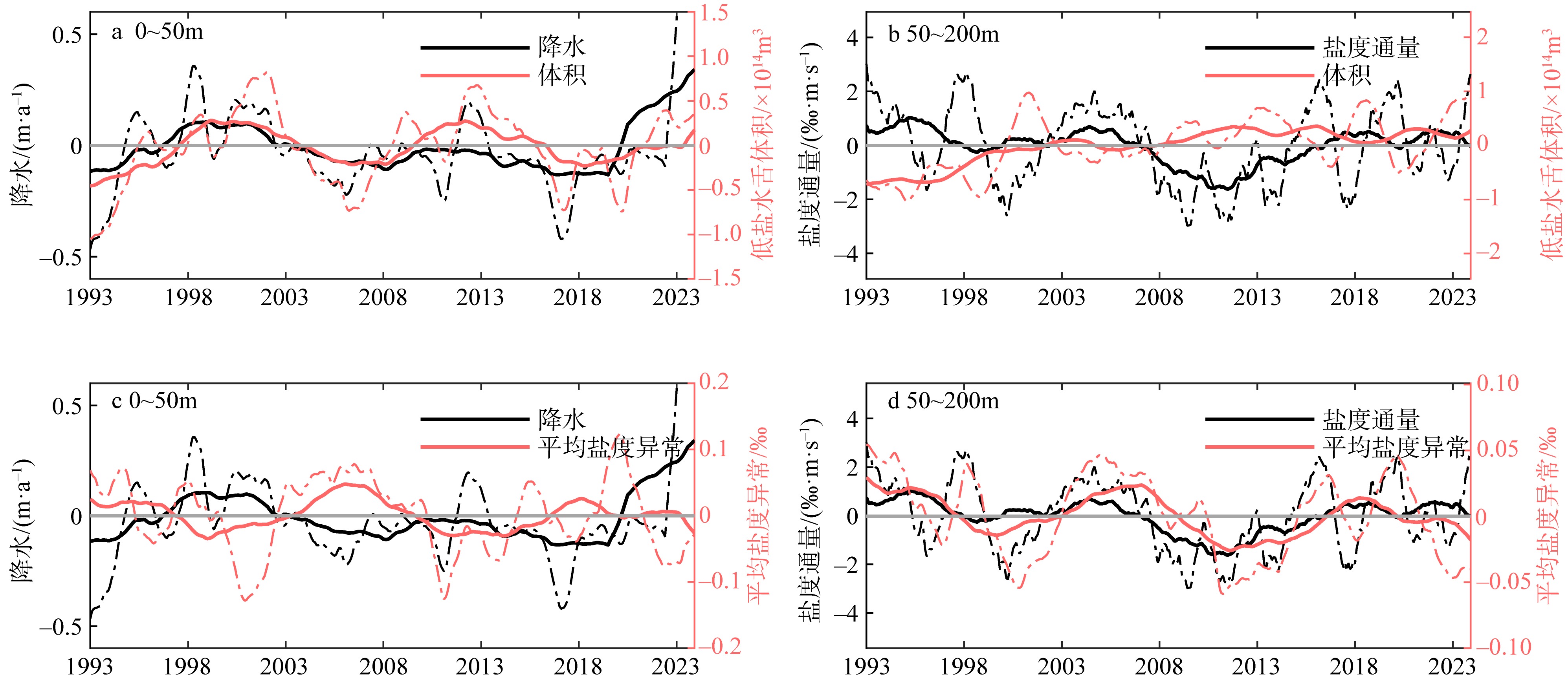 Relationship between the volume and salinity of low salinity tongue in the surface (0 to 50 m) and subsurface (50 to 200 m) layers and local precipitation and ITF salt flux. (a) Time series of the volume of the low-salinity tongue at 0 to 50 m and local precipitation; local precipitation refers to the rainfall over areas surrounded by the low-salinity water; (b) time series of the volume of the low-salinity tongue at 50 to 200 m and the salinity flux through section IX1; (c) time series of the average salinity anomalies of the low-salinity tongue at 0 to 50 m and local precipitation; (d) time series of the average salinity anomalies of the low-salinity tongue at 50 to 200 m and the salinity flux through section IX1. The solid red line and dashed red line represent the 7-year running mean and 13-month running mean, respectively"