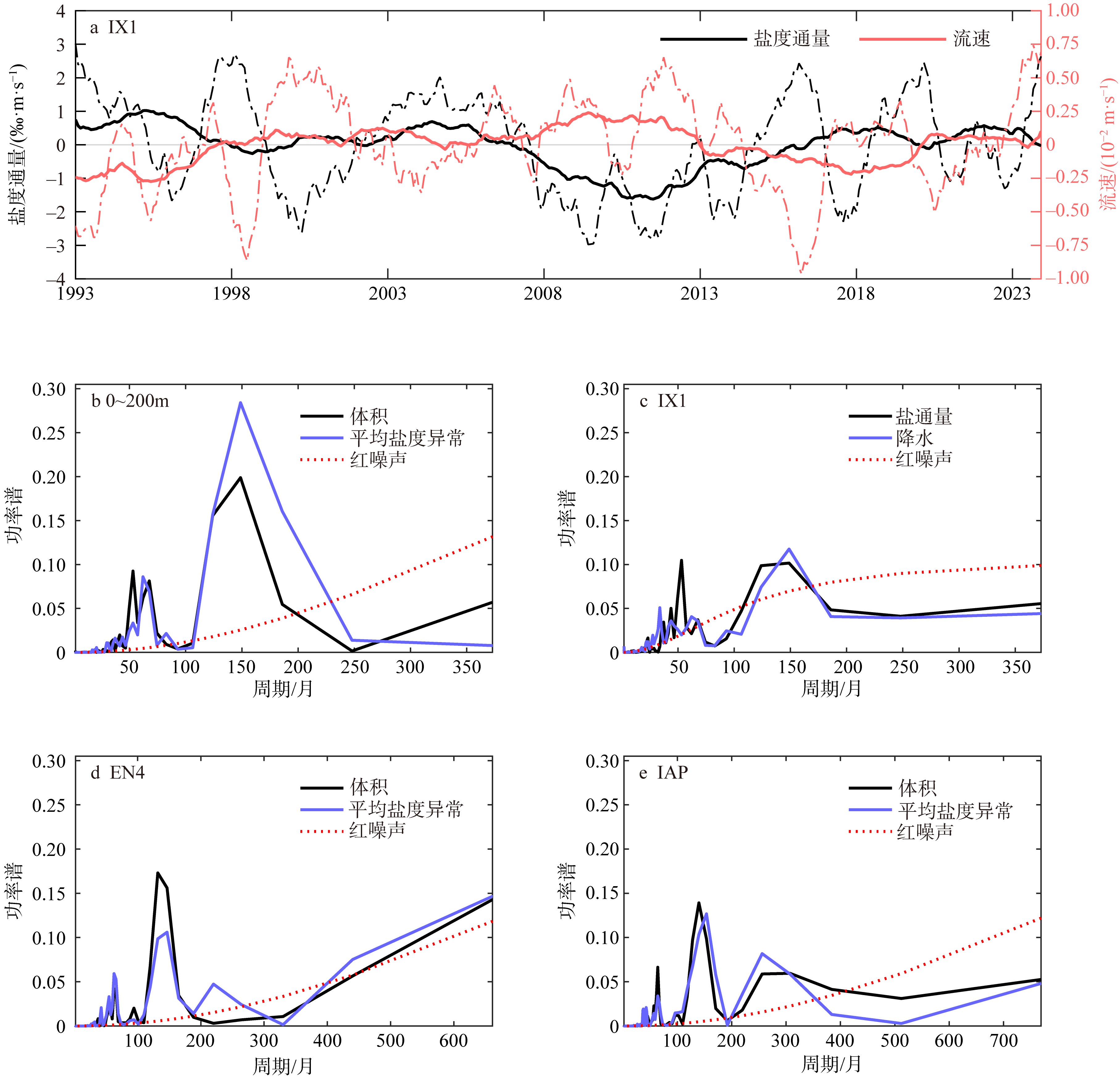 Spectral characteristics of the low-salinity tongue, local precipitation, and ITF salt flux, and the salinity-velocity structure across section IX1. (a) Time series of the salt flux through section IX1 (solid black line: 7-year running mean; dashed black line: 13-month running mean) and the mean current velocity (red line) across the section; (b) power spectrum of the volume (black line) and average salinity anomalies (blue line) of the low-salinity tongue with the red line denoting the red-noise spectrum; (c) similar to (b), but for the salt flux through section IX1 (black line) and local precipitation (blue line); (d), (e) similar to (a), but based on EN4 salinity data (1970 to 2023) and IAP salinity data (1960 to 2023)"