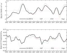 Time series of the volume and average salinity anomalies of the low-salinity tongue from multi-source data (water bounded by the 34.6 ‰ isohaline within the upper 200 m in the region 4° to 20°S, 40° to 145°E. (a) Time series of the volume of the low-salinity tongue in the upper 200 m, derived from the GLORYS12V1 (black line), IAP (blue dashed line), EN4 (green dashed line), and Argo (red dashed line) datasets; (b) similar to (a), but for the average salinity anomalies of the low-salinity tongue"