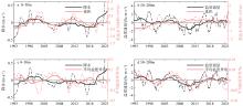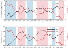 Time series of PWCI, TPI, and the volume of the low-salinity tongue. (a) The TPI (red line) and PWCI (black line) after a 7-year running mean; red shading denotes periods when the volume of the low-salinity tongue is greater than 0.3σ (freshing periods), and blue shading denotes periods when it is less than −0.3σ (salinification periods); (b) similar to (a), but for TPI (red line) and the volume of the low-salinity tongue in the upper 200 m (black line)"