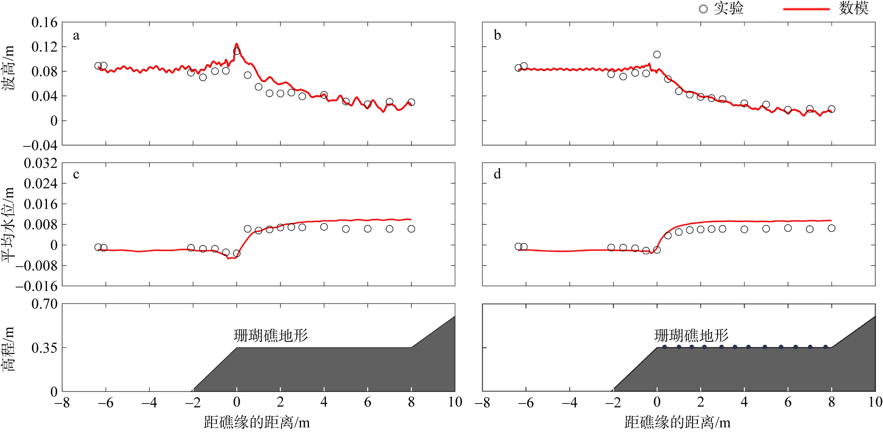 图4 标准工况(H0=0.08m, T=1.5s, hr=0.10m)下波高(a、b)和平均水位(c、d)的沿礁分布a, c: 光滑礁面; b, d: 粗糙礁面 Fig. 4 Along-reef distributions of (a, b) wave height (H) and (c, d) mean water level (MWL) under standard conditions (H0=0.08 m; T=1.5 s; hr=0.10 m).(a, c) smooth reef surface; (b, d) rough reef surface |