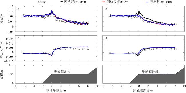 图2 标准工况(H0=0.08m, T=1.5s, hr=0.10m)下3种网格尺寸(0.01m、0.02m和0.03m)的波高和平均水位的沿礁分布a, c: 光滑礁面; b, d: 粗糙礁面 Fig. 2 Along-reef distributions of wave height and mean water level for three grid sizes (0.01 m, 0.02 m and 0.03 m) under standard conditions (H0=0.08 m; T=1.5 s; hr=0.10 m). (a, c) smooth reef surface; (b, d) rough reef surface |