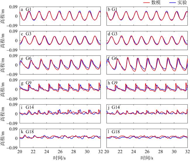 图3 标准工况(H0=0.08m, T=1.5s, hr=0.10m)下沿礁有代表性测量位置(G1、G3、G6、G9、G14和G18)自由液面的时间序列左列: 光滑礁面; 右列: 粗糙礁面 Fig. 3 Time series of free surface elevation at representative measurement positions (G1, G3, G6, G9, G14 and G18) along the reef under standard conditions (H0=0.08 m; T=1.5 s; hr=0.10 m). Left panels: smooth reef surface; right panels: rough reef surface |