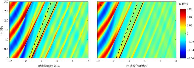 图6 标准工况(H0=0.08m, T=1.5s, hr=0.10m)下礁缘附近波浪自由液面时空分布a. 光滑礁面; b. 粗糙礁面。黑色实线为主频波, 黑色虚线为二次谐波 Fig. 6 Spatiotemporal distributions of wave free surface near the reef edge under standard conditions (H0=0.08 m; T=1.5 s; hr=0.10 m). (a) smooth reef surface; (b) rough reef surface. Black solid lines represent primary frequency waves; black dashed lines indicate second harmonics |