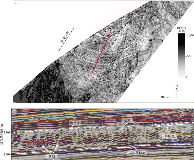 图6 MTC3内发育的逆冲褶皱带a. 逆冲褶皱带振幅切片; b. 振幅切片解释图, 玫瑰花图表示挤压断层的走向, 反映MTC3的运动方向; c. 逆冲褶皱带中的横向地震剖面; d. 逆冲褶皱带中的纵向地震剖面 Fig. 6 Thrust-fold systems developed within MTC3. (a) Amplitude slice of thrust-fold belt; (b) interpreted amplitude slice; (c) cross-sectional seismic profile through thrust-fold belt; (d) longitudinal seismic profile through thrust-fold belt |