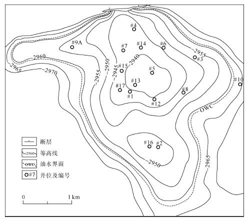 Fig. 1 Top map with contour line of M10 reservoir图1 M10层顶面构造等值线图(《中国油气田开发志》总编纂委员会, 2013) |