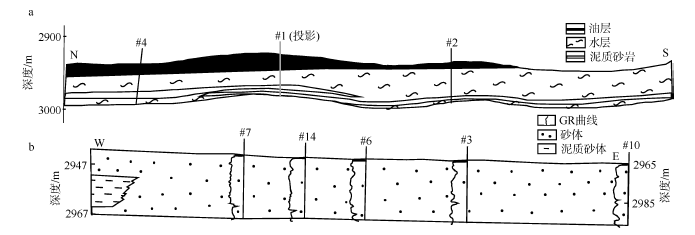 Fig. 2 NS reservoir profile (a) and WE cross well section (b) with Gamma Ray (GR) logs for M10 reservoir图2 M10层近南北向油藏剖面 (a) 和近东西向过井沉积剖面图 (b) |