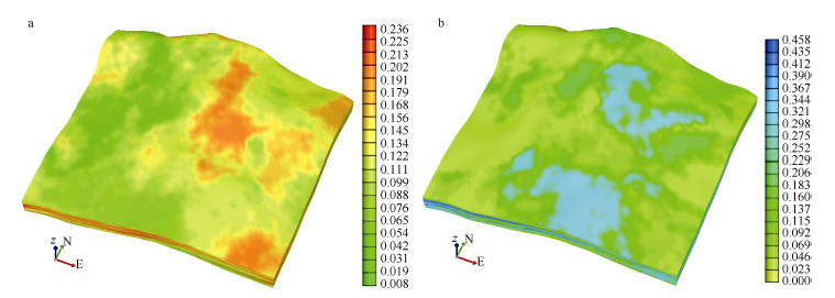 Fig. 5 3D model of porosity (a) and permeability (b) for M10 reservoir with z direction extended 10 times图5 M10层三维孔隙度(a)和渗透率(b)属性模型(z方向放大10倍) |