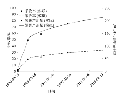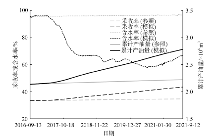 注: 采收率为注CO2驱的采收率; 采收率提高程度为相对于未注CO2驱的采收率增加百分比(未注CO2时采收率为34.68%); 累积CO2注入量、生产量和封存量均为地表条件下。 |