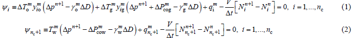 为m中i的注采比; V为网格体积; Δt为时间差; nc为组分数; Ni (i=1, ... , nc)为i组分的摩尔数, 是孔隙度及油、气组分的密度和饱和度的函数,