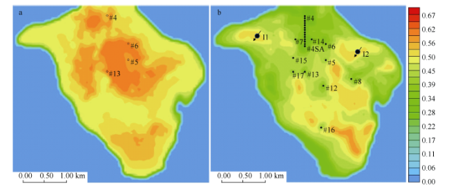 Fig. 9 Contour maps of simulated results. Oil saturation distribution in 1990 (a) and at the beginning of CO2 injection in 2016 (b). The black dots represent production wells with two designed CO2 injection wells of I1 and I2. The CO2-EOR-S simulated process begun in September 2016 after injection wells were opened图9 等值线模拟结果图 |