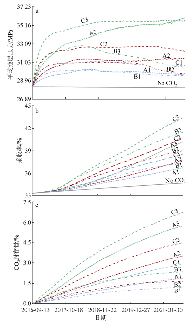 Fig. 10 Curves of average formation pressure (a), recovery ratio (b) and CO2 storage (c) for nine cases图10 模拟结果对比曲线 |