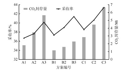 Tab.4 CO2 sequestration queuing of nine cases表4 各方案CO2封存量统计表格 |